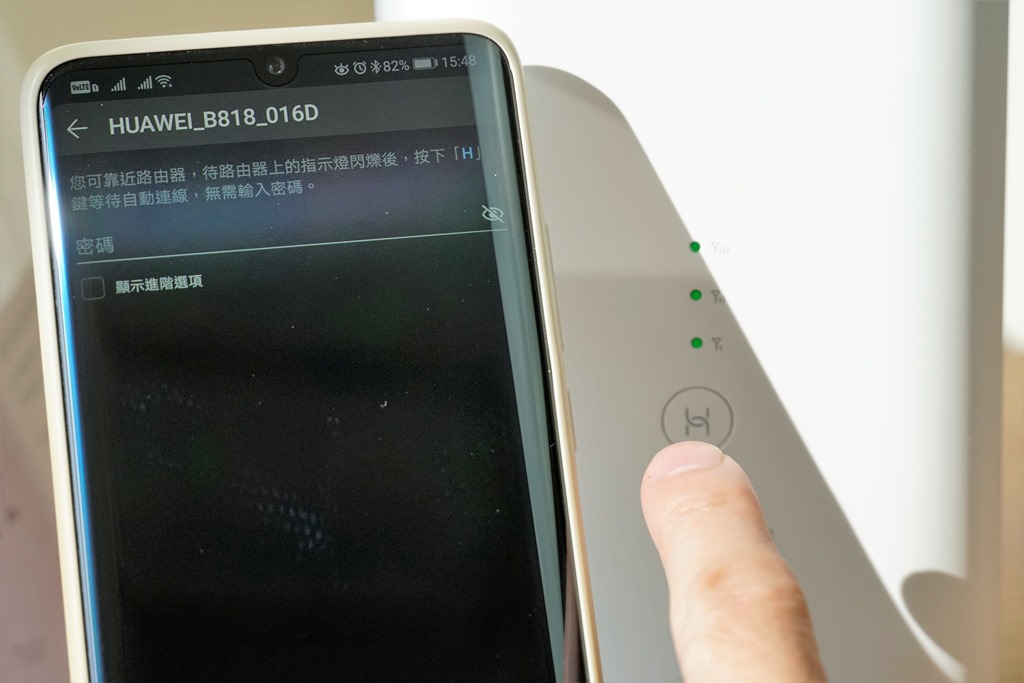 要將你的智慧型手機連接到 HUAWEI B818-263 無線路由器方式超簡單,如果你是使用華為智慧型手機的朋友,只要打開 WiFi 後選擇 HUAWEI B818 字樣的網點,接著按下路由器正面的 H 鍵,不用輸入密碼就可以開始連網,超級簡單。