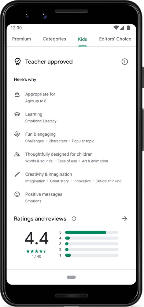 根據 Google 說明,「兒童」的分類會依照年齡、用戶體驗、app 內容的豐富程度來做區分,如果 app 有通過老師們的認可,除了會在分類中看到之外, app 下方也會有著「老師認可」的打勾徽章,描述中還會寫上獲得老師們高度評價的理由,來協助家長衡量這個 app 到底適不適合自己的孩子。