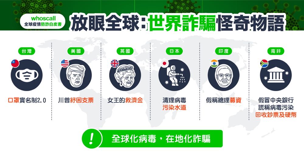 新冠肺炎病毒擴散全球,各地的詐騙集團緊跟當地疫情變化、因應政策和生活議題,依據當地民情、口音、時事,量身打造千奇百怪的詐騙手法,在各地詐取不義之財!透過 Whoscall 全球詐騙回報分析,與你一探各國詐騙怪奇物語!