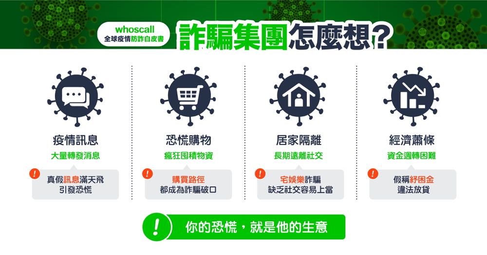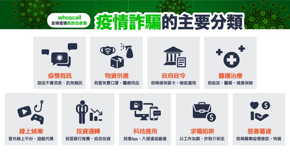 新冠肺炎全球持續肆虐,詐騙集團掌握了近期社會變化的四大指標,衍伸出各種詐騙手法,想要大發災難財!從大家熟知的口罩詐騙,到假稱網購系統、政府救濟補助、疫苗投資等等,各式各樣的詐騙持續擴大中。Whoscal l獨家拆解詐騙集團視角,360 度透析疫情詐騙的主要分類: