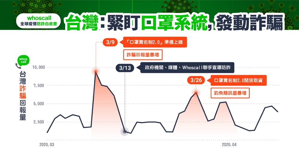 隨後疫情指揮中心、各大媒體與Whoscall聯手向民眾宣導「口罩系統不會打給你」,詐騙回報量明顯驟降。然而隨著口罩預購取貨日將近,詐騙集團捲土重來,假冒口罩到貨的釣魚簡訊,導致詐騙回報量再度暴增,並在 3 月 26 日取貨首日達到高峰。可以看出詐騙集團緊跟口罩政策的各項時機,不斷變換手法和名義行騙。