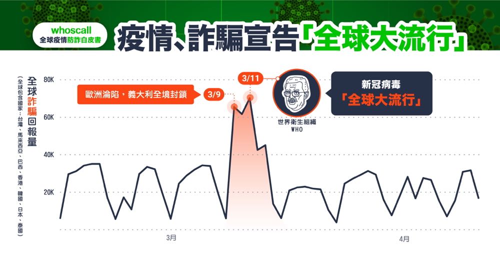 自三月初肺炎疫情快速升溫,短時間內迅速蔓延至全球超過 100 多個國家,其中韓國、義大利、伊朗的確診病例更是直線飆升。就在 3 月 11 日,世界衛生組織 WHO 終於正式宣布 COVID-19 病毒「全球大流行」。全球對疫情的擔憂與恐慌之情,一觸即發。根據 Whoscall 全球資料統計,全球詐騙量也隨之暴增,創下歷史新高!包含台灣、香港、日本、泰國、馬來西亞、巴西,各地詐騙電話的回報數量,都飆漲了 3 倍以上。