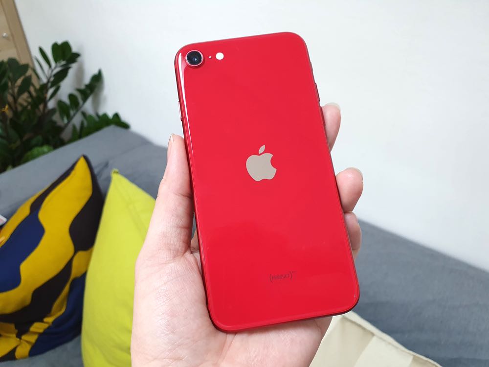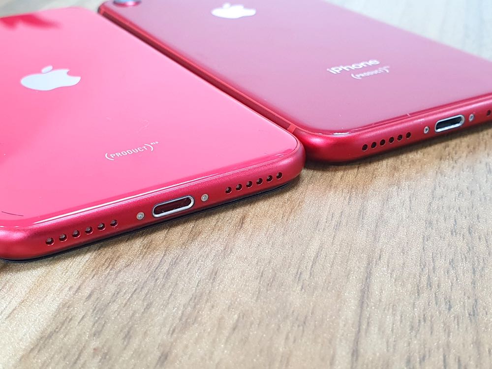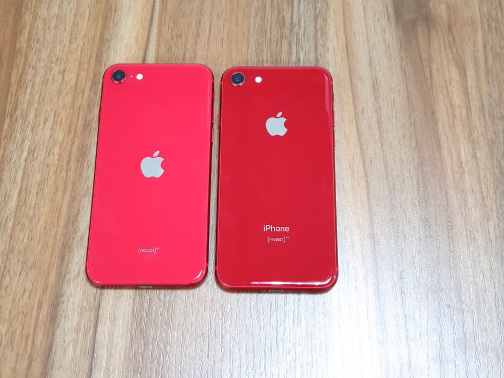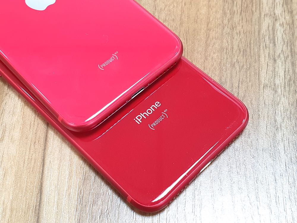 ▼ iPhone SE 2 與 iPhone 8 此次體積重量都一模一樣,但可以發現兩款的蘋果 logo 位置並不相同,而且即便都是 (PRODUCT) RED,但 iPhone SE 2 的紅似乎更為通透。