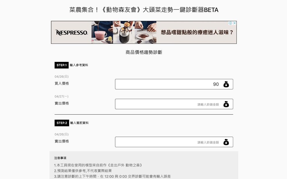 只要在診斷器中輸入連續幾天的大頭菜收購價格,就會自動計算出接下來幾天的價格走勢,一般來說大頭菜的價格關鍵期是週四與週五,因此大家剛好可以在週一至週三來紀錄大頭菜價格,然後在週四時開始使用計算機,來決定接下來的最佳販售時機點。