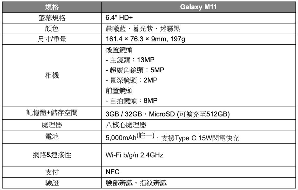Galaxy M11 共有晨曦藍、暮光紫、迷霧黑三款顏色,建議售價 NT$3,990,預計於 5 月 4 日起在三星商城、PChome 24h 購物、MOMO 購物網、Yahoo! 購物中心、ETmall 東森購物、蝦皮商城三星旗艦館、LINE 口袋商店及 udn 買東西等指定線上通路發售。