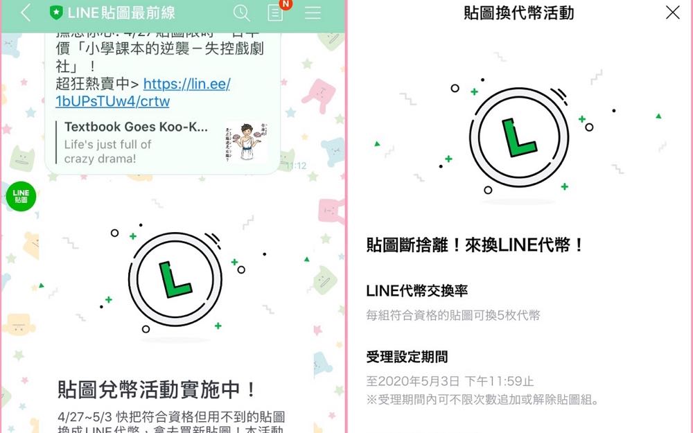 活動方式:符合活動資格且為自行購買的 LINE 貼圖可以登錄兌換為 LINE 代幣,每組貼圖兌換 5 枚LINE代幣,無兌換上限,LINE 代幣將於 5 月 3 日以後陸續開始發送