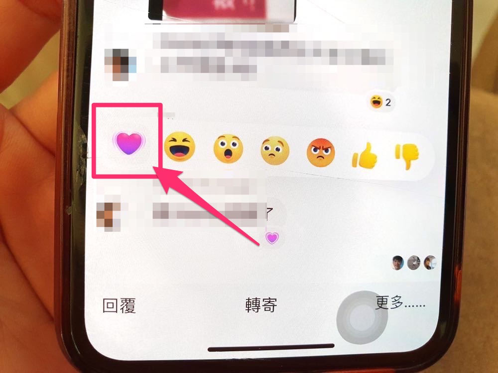 使用方式是,長按想要回應的訊息,叫出反應圖示清單(就是有讚、爛、生氣、哈…的那串),這邊可以看到傳統的紅色愛心。長按愛心不放,可以看到圖示越變越大,並跑出「變更大心圖示」的訊息。