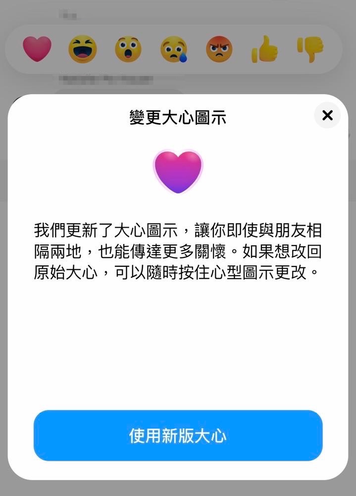 這個紫色愛心目前已經全面更新,如果用戶沒有在訊息中看到紫色大心的符號,可以透過更新來顯示。等更新完後,我們只要在訊息上長按叫出表情符號(平常紅色愛心、大笑、讚、生氣、哭泣的那些),這時長按原本的「紅色愛心」,會發現跑出「變更大心圖示」的訊息。
