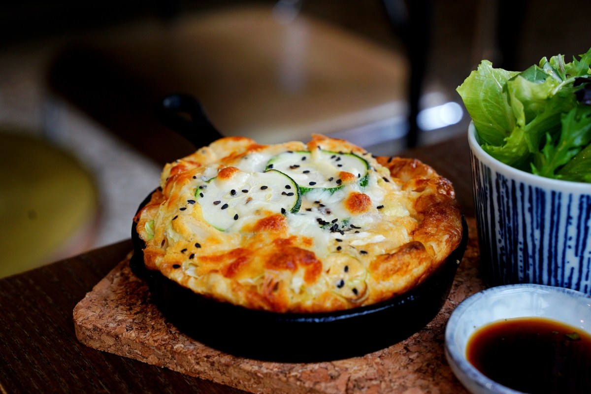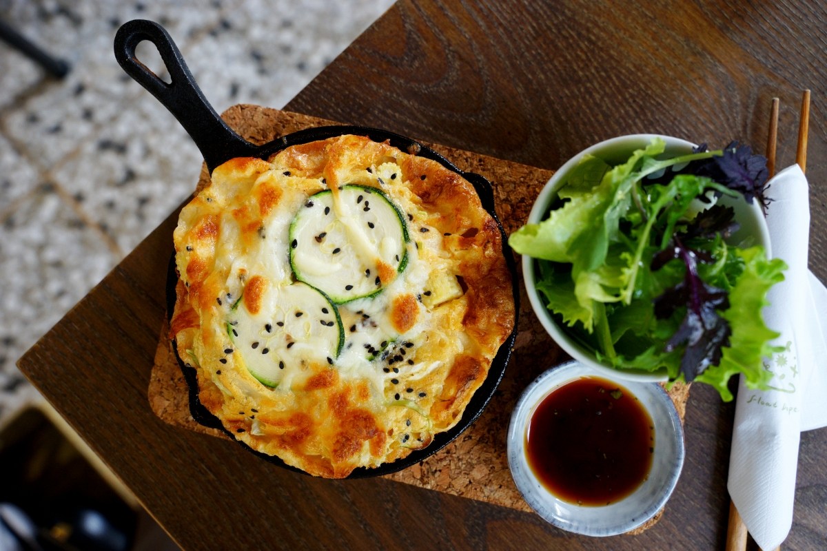 料很多的蛋餅,裡面真的料很多,火腿、起司、蛋、蔬菜⋯⋯滿滿的內餡,上面還有兩片櫛瓜,現點現做的蛋餅要稍等一會兒,口感蓬鬆柔軟,和我想像中的蛋餅不同,以為會是有餅皮的常見蛋餅,又或是粉漿蛋餅,結果用熱騰騰的鐵鍋端上來,在我面前的,比較像是總匯烘蛋。沒關係,好吃就好!我心裡想著。
