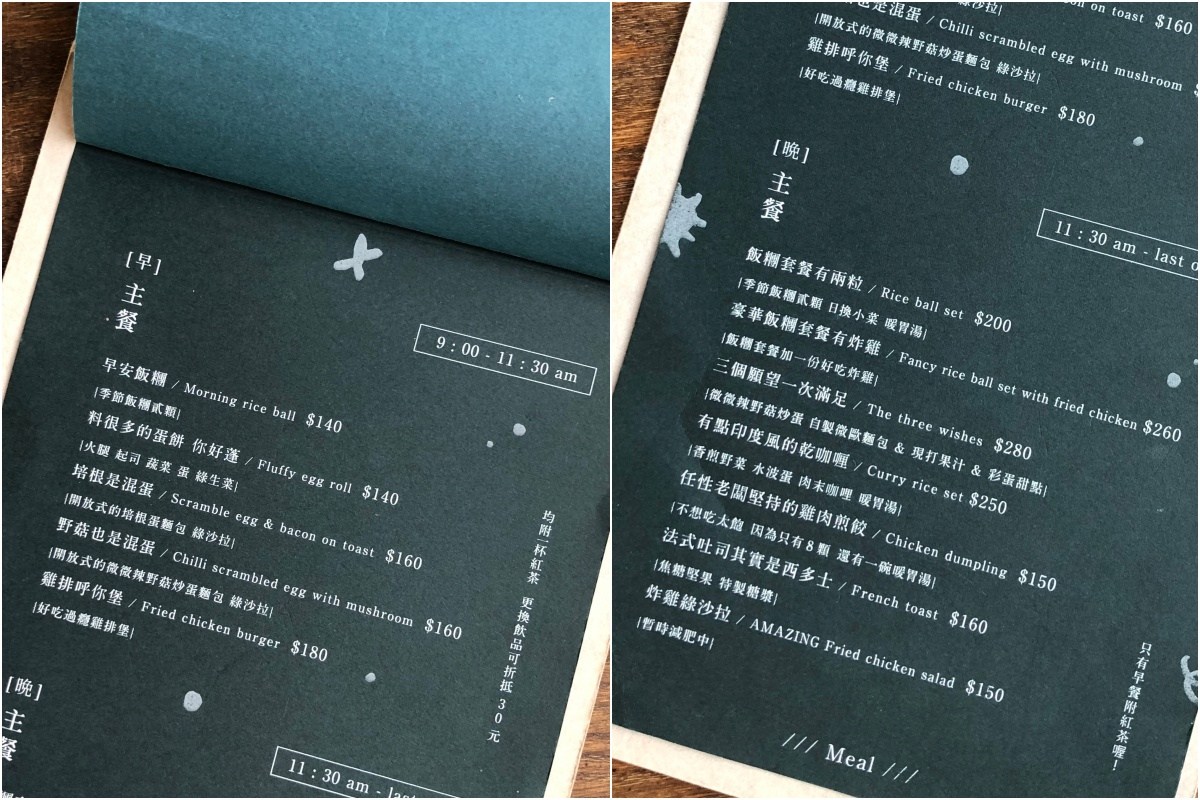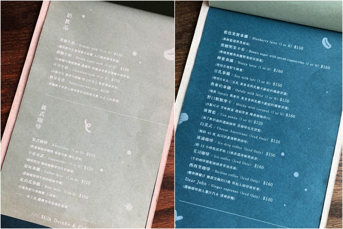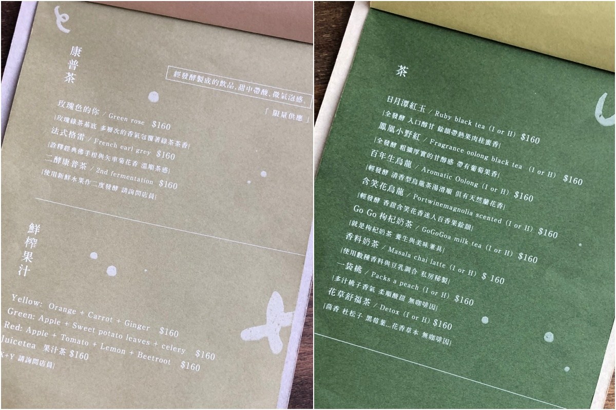 飲品選擇多樣,義式咖啡、茶飲、康普茶、奶飲品皆有,餐點分為早餐(9:00-11:30)與晚餐(11:30-最後點餐時間),看起來不多,但每樣看品名就好想吃吃看,下次還想再訪。價格與一般咖啡館、早午餐差不多,可以接受。