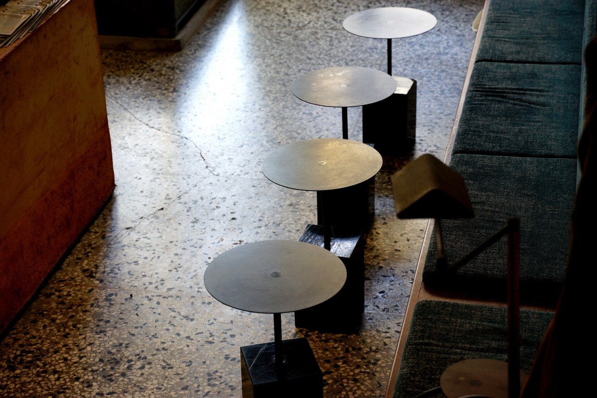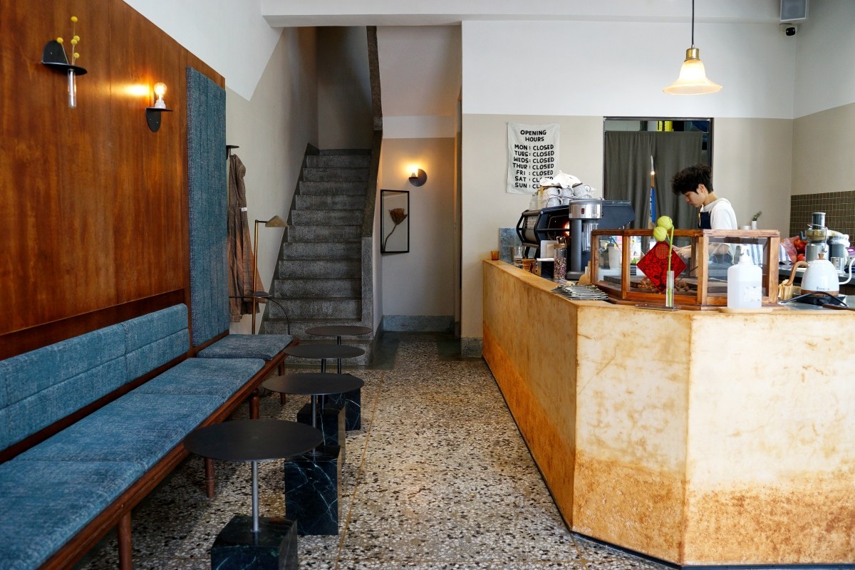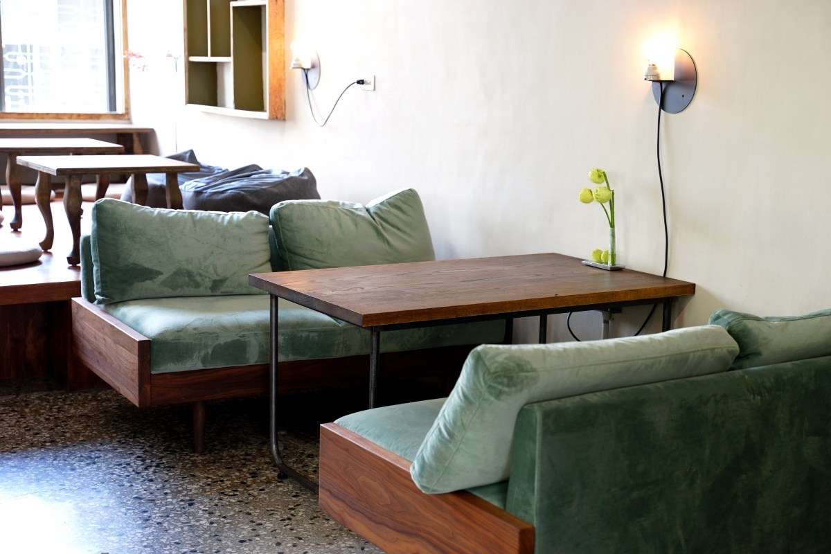 微生有股很強的魅力,會讓人想去了又去,拍照拍不膩,就算不拍照,和朋友待在那個空間也覺得幸福。仿舊灰綠色的門不太好開,帶點小尷尬的開了門,會突然被空間吸引,像極了歐美影集的復古風格的藍綠色椅墊配上深淺木色的空間,一樓的咖啡、點餐氛圍,都讓人對設計空間的人產生好奇,與新竹的生地餅舖同一個設計工作室「本事空間製作所」有去過生地餅舖的朋友,應該都有感受到,是說最近生地餅舖最近又不賣咖哩飯,回來賣披薩了,太好拉~我終於可以吃了(笑)。