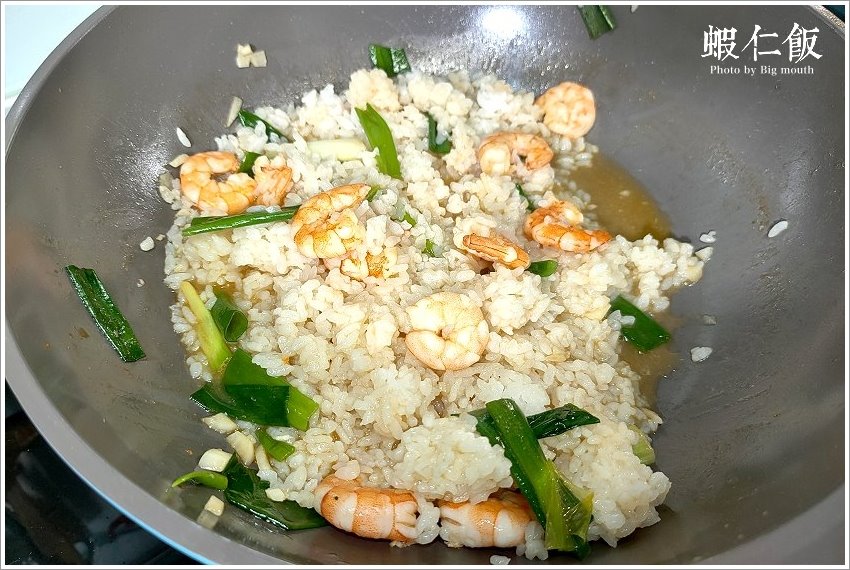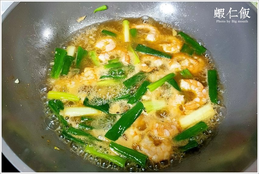 ▼接著放油開始拌炒蔥白、蒜末、蝦仁等,最後再下蔥綠提香!
