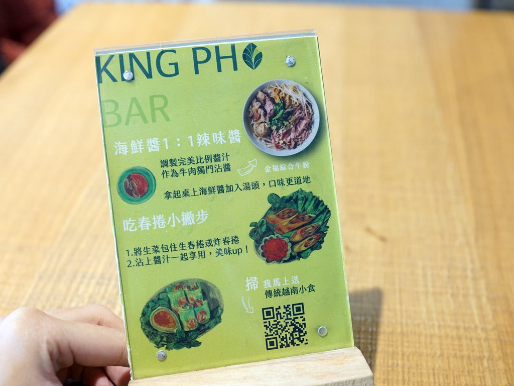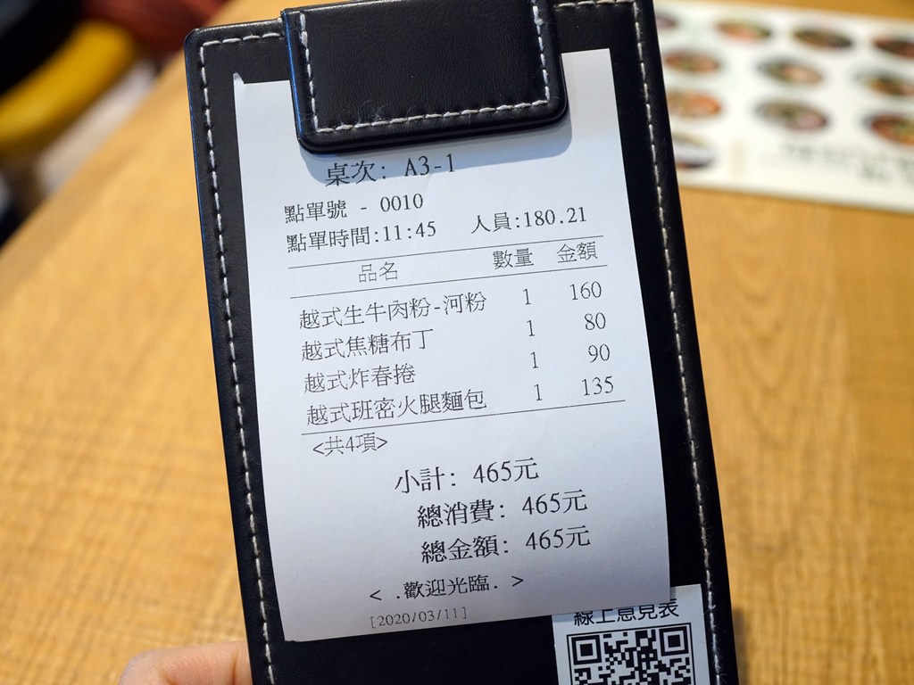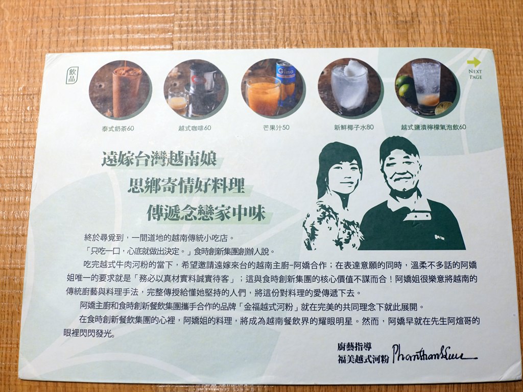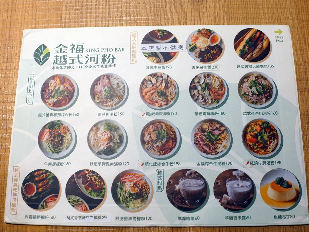 提供越南河粉系列、越式經典乾拌撈檸粉系列、越式米飯與麵包及越式甜點,種類還蠻多的!價格介於120-230元之間,蠻多網友反應價格偏貴,我一開始看菜單也這麼覺得,但若以餐廳標準來看就會覺得可接受,而且內用有提供泰奶跟檸檬汁無限暢飲,一般越式小吃店點主餐加飲料價格也差不多~