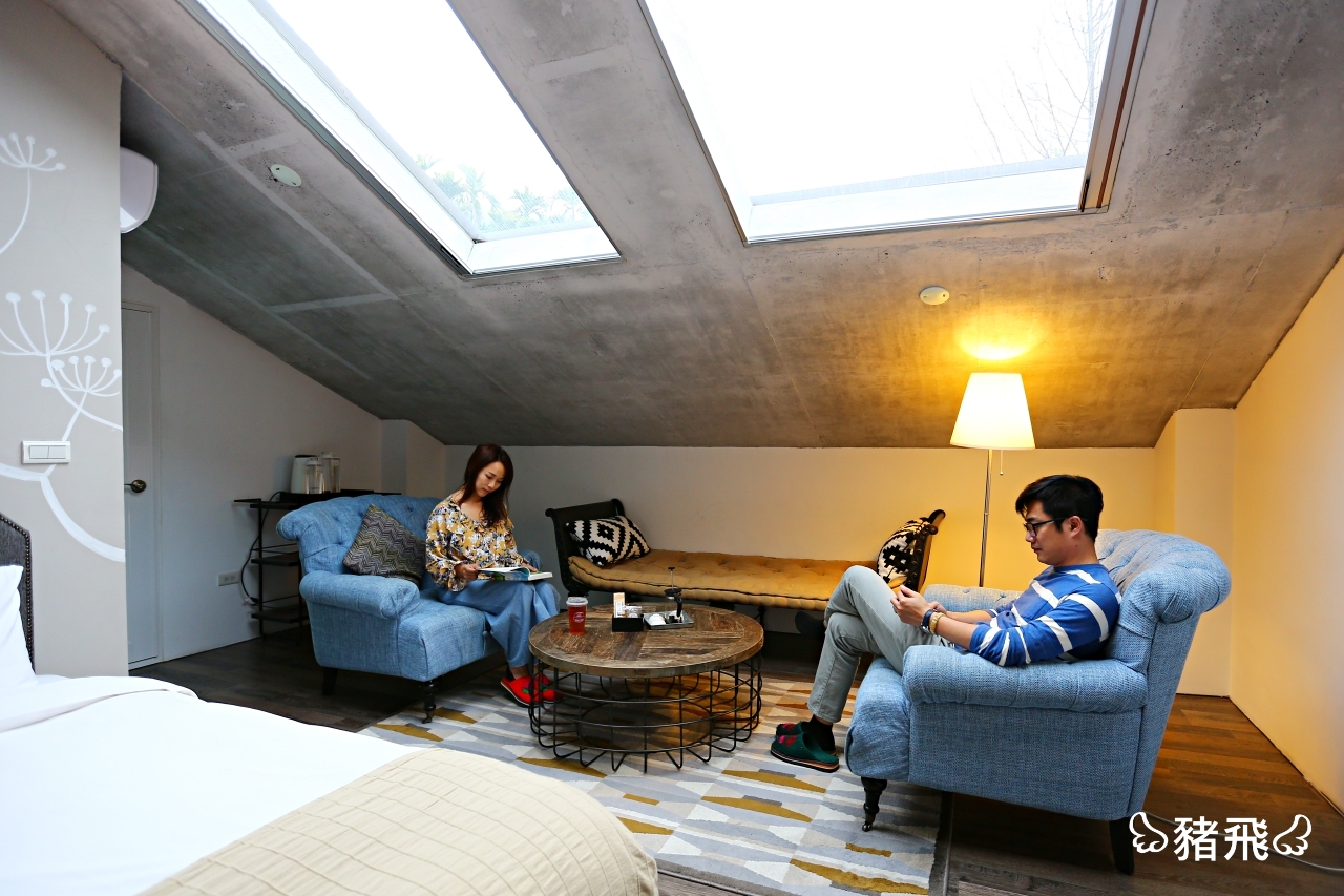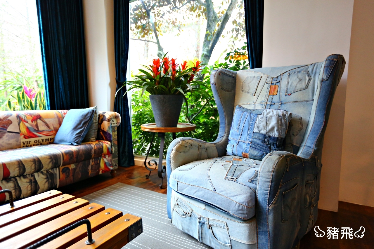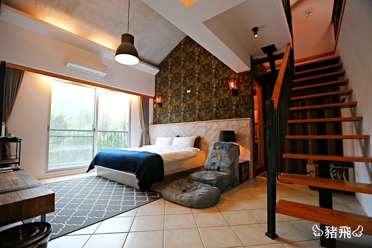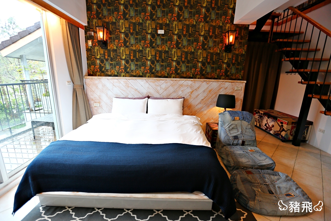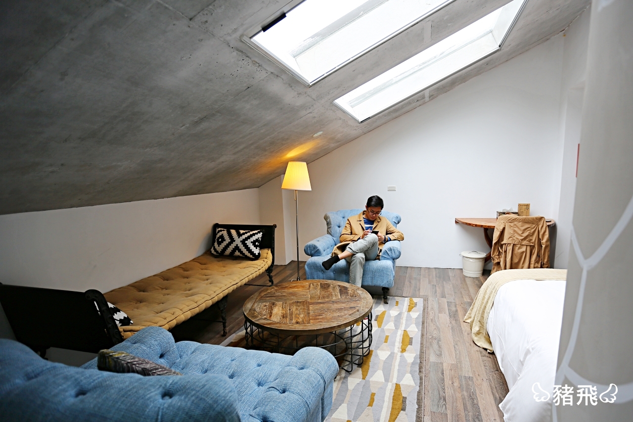 雙人床的旁邊擺了一張跟客廳同系列的「牛仔褲沙發」,這個充滿設計感的沙發椅非常吸睛,坐起來也挺舒服的。木製階梯往上走是和室型四人房。