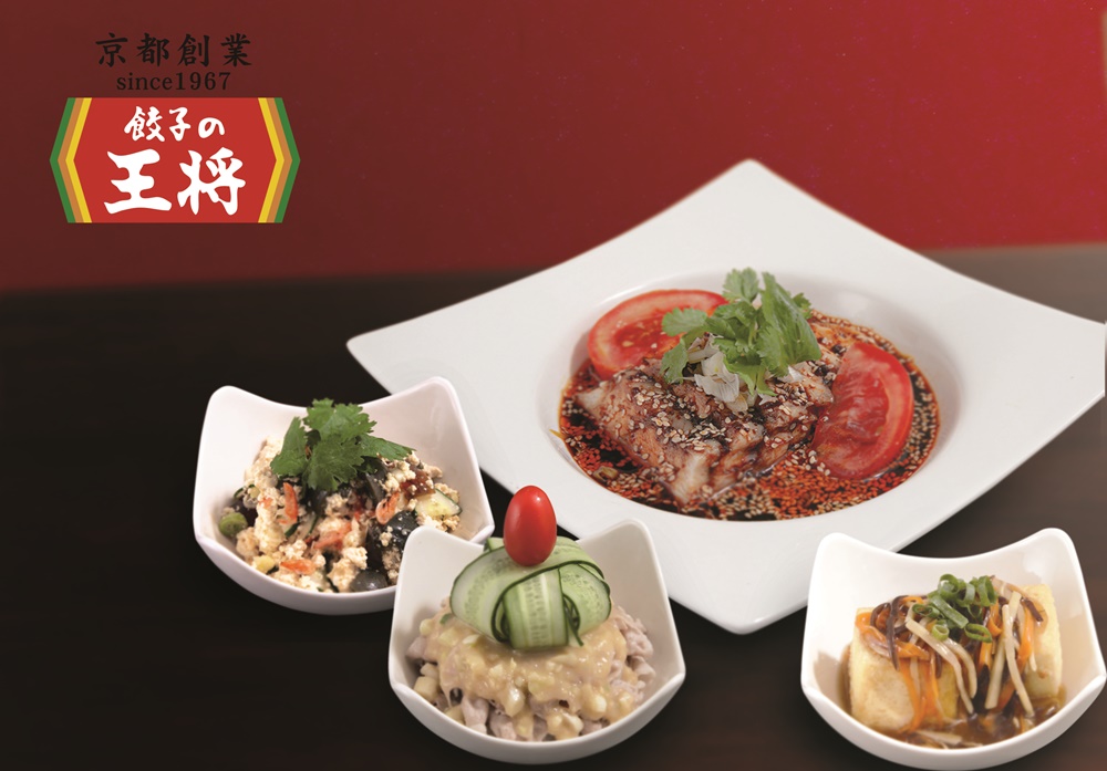 王將這次也獨自開發完美融合台灣與日本風味的食譜,將台灣所為人熟知的蒜泥白肉及皮蛋豆腐等菜色加入菜單,還有加入特製香辣醬的「口水雞」,以及淋上特製高湯的「日式揚出豆腐」等前菜 ,搭配餃子更加對味。