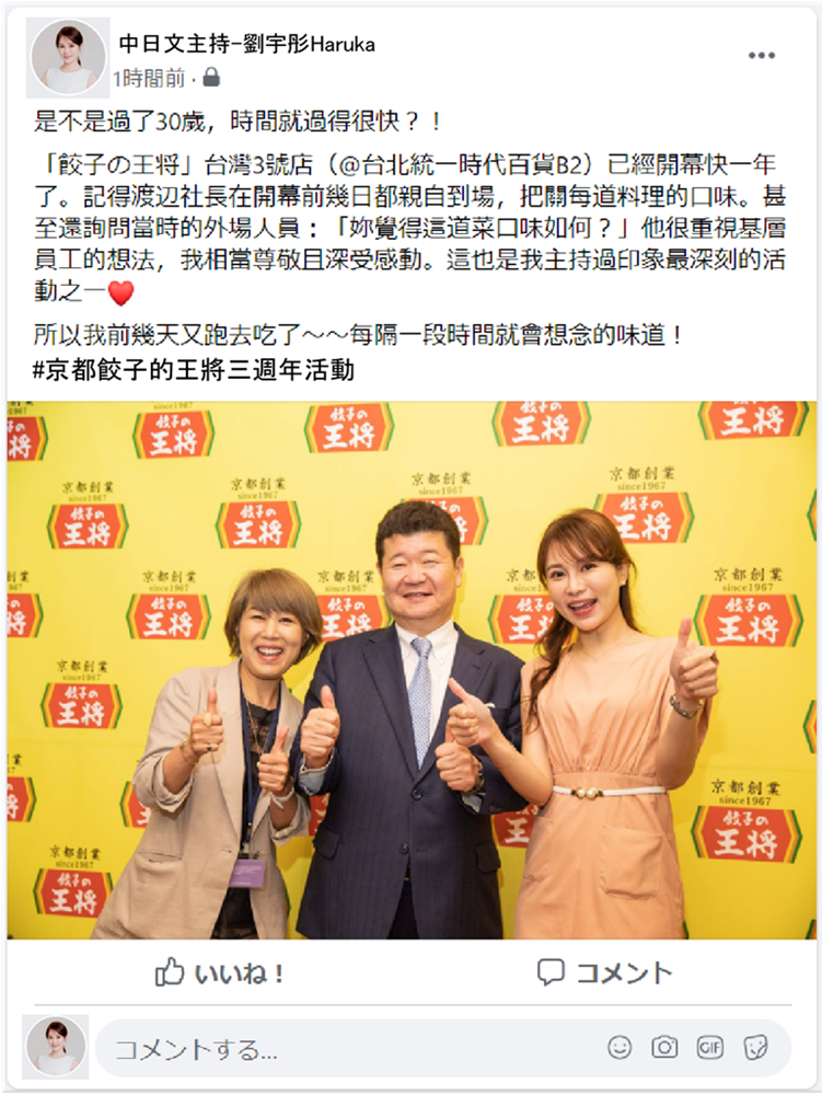 在日本每日賣出200萬顆餃子的日本最大中華料理連鎖店「京都餃子の王將」即將迎接進軍台灣3週年紀念,王將表示這3年間所賣出的煎餃數量拼接起來的話,相當於高鐵台北站至彰化站的距離,為了回饋台灣的消費者,將於4月20日、21日期間、全台3店舗:高雄漢神巨蛋店、高雄漢神成功店、台北統一時代店,贈送餃子的王將招牌菜「王將煎餃」免費餃子兌換券,給在店內用餐或外帶的顧客們。