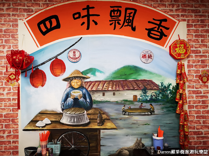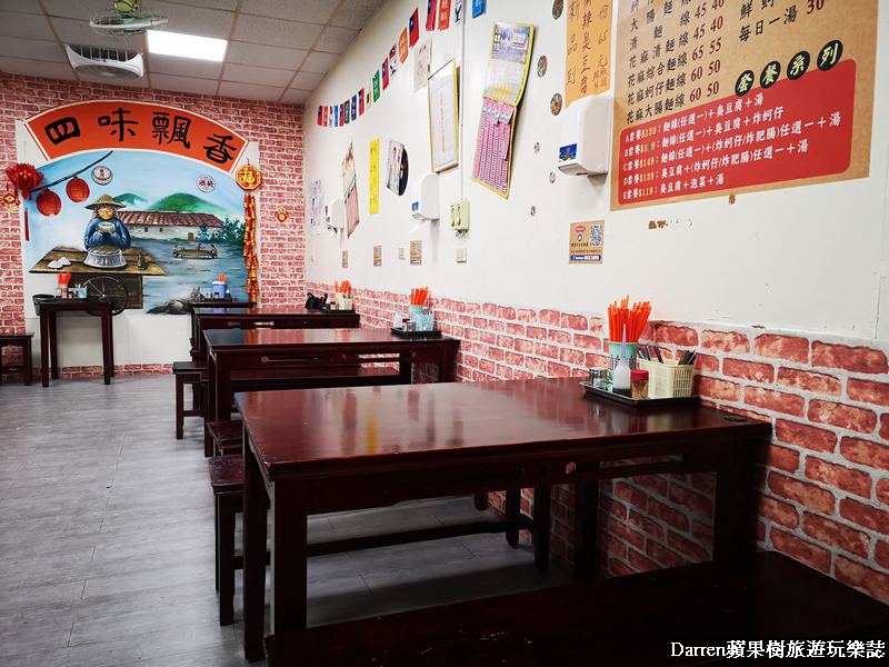 店內用餐空間明亮乾淨,大概有4到5張四人桌,裝潢帶點懷舊復古風,牆面上有小時候比較常見的搓搓樂、抽獎遊戲、尪仔標等好玩的童玩,後面還有面四味飄香的彩繪壁畫,四味飄香老闆非常好客,有空閒時間都會跟店內客人聊上幾句