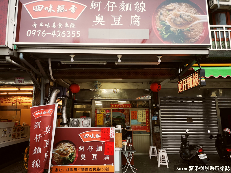 四味飄香臭豆腐大腸麵線就在平鎮義民路消防隊附近,鄰近老街溪旁邊,之前去吃二堂頭銷魂鴨肉飯有經過看到這家店,招牌很明顯店面看起來很新,所以就默默收到口袋名單,這次走過路過沒有錯過專程來插旗四味飄香