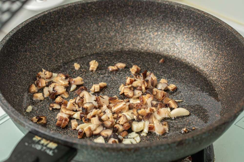 2.起油鍋放入紅蔥頭或蒜頭後爆香,再放入香菇丁炒至香味溢出。