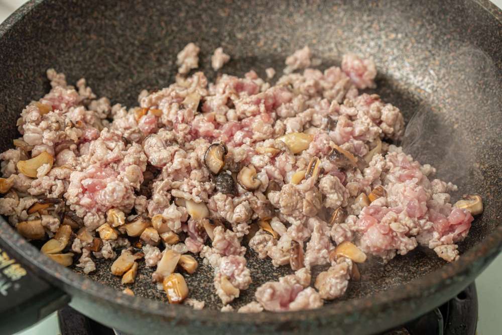 3.加入豬絞肉炒至八分熟、外觀大多變白色的程度。
