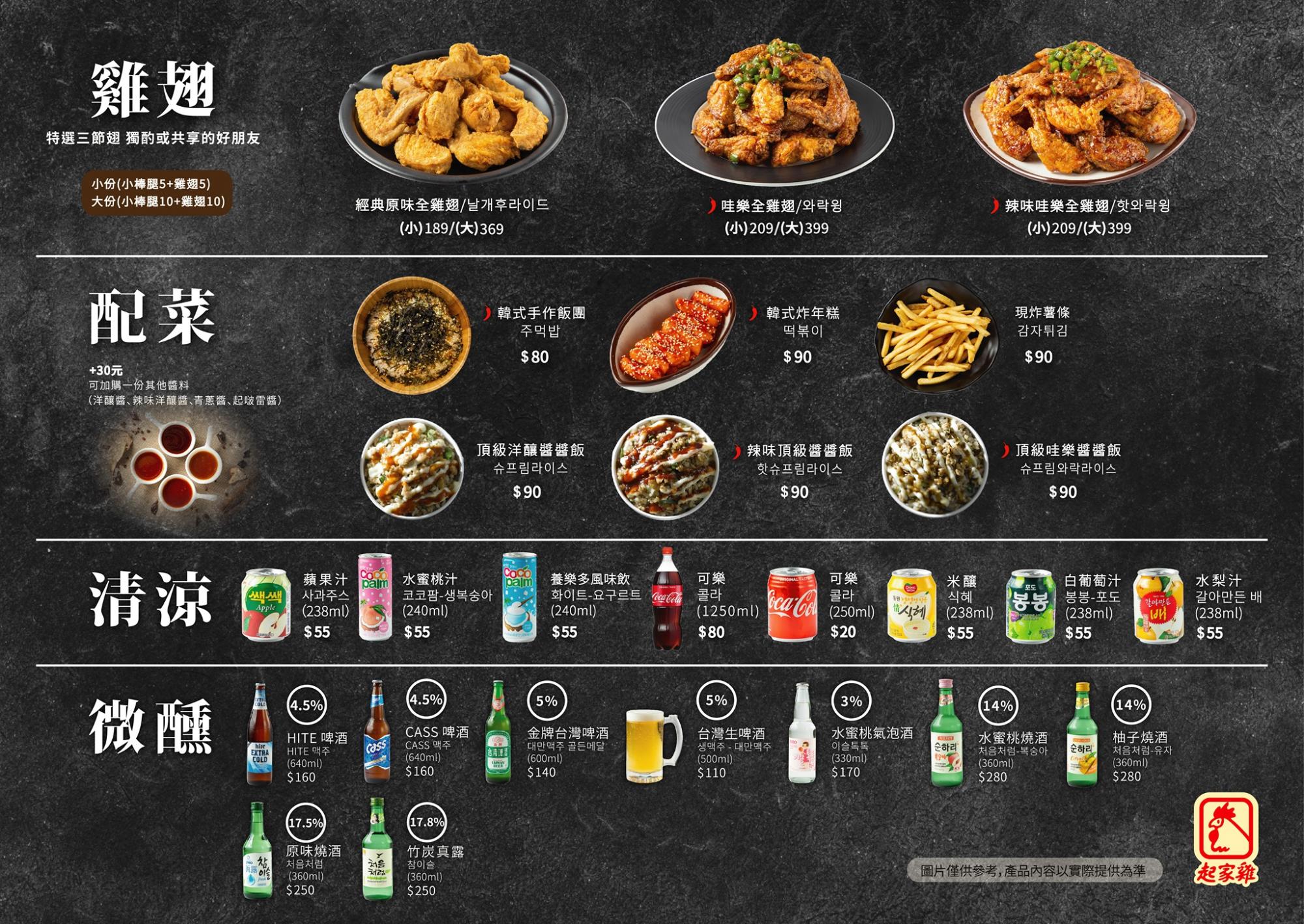 韓式炸雞共有八種口味,可點全雞(同口味)或半半炸雞(雙口味)、去骨炸雞(同口味),另外還有手作飯糰、炸年糕、醬醬飯等配菜,韓國飲料跟韓國啤酒可以搭配~採現點現炸,需等候15-20分鐘,視現場情況而定,如果打算外帶建議先電話預訂,或是利用外送系統訂餐以免久候。