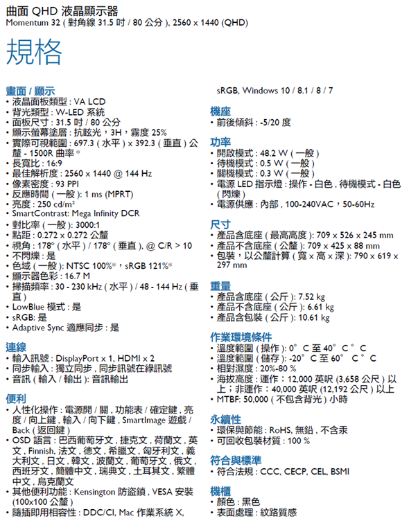 在居家工作的期間,當然不只有工作,我們也要找時間偷閒一下,能夠有著一機多用的螢幕絕對是非常棒的體驗。我覺得飛利浦 Momentum 325M8C 曲面顯示器,不只在工作中可以讓你降低長時間工作的疲勞感,在忙裡偷閒打電動看劇時,也有非常優異的表現,而這些功能你都只需要按個按鍵就馬上切換。最後分享官方提供的規格表給大家參考,或許這台顯示器就是解決居家工作疲累的解方。