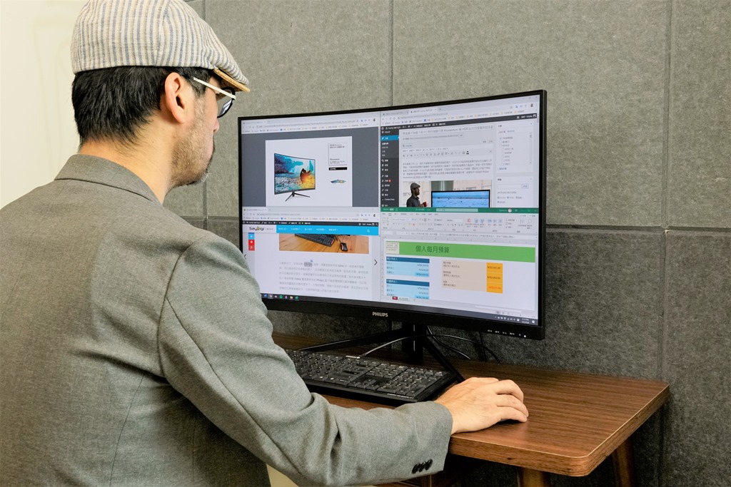 居家工作當然就是要將筆電接上舒適的大螢幕與鍵盤滑鼠,讓工作體驗更輕鬆,飛利浦 Momentum 325M8C 使用 32 吋曲面顯示器,並有著 2560 x 1440 QHD 高解析度,在工作時常需要多視窗同步進行不同工作,像是與同事主管對話的群組一定要開著,讓在家工作就像在辦公室般容易溝通、另外像是文書軟體、網頁資訊或是居家工作不無聊的音樂軟體,你都可以讓 32 吋大螢幕輕鬆分割成二到四個視窗同時進行。