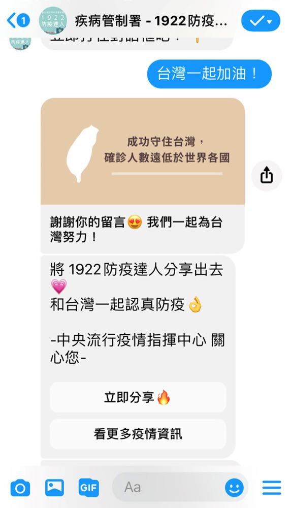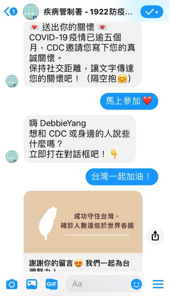 為了讓人們可以表達對彼此的關心,民眾在疾病管制署 Facebook 粉絲專頁的貼文底下,或是在觀看中央流行疫情指揮中心嚴重特殊傳染性肺炎記者會直播時,留言「台灣加油 一起正向防疫!」,將被導向疾病管制署的 Messenger 帳號。透過和疾病管制署的 Messenger 聊天機器人互動,表達對於疾病管制署與親朋好友的關懷,在 Facebook 上分享愛跟祝福,和疾病管制署一起守護台灣。