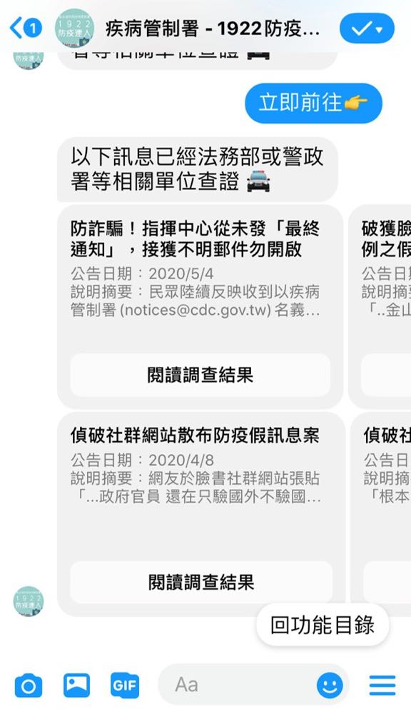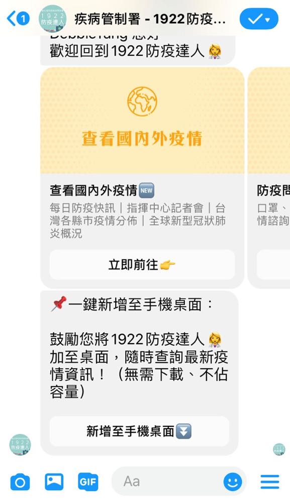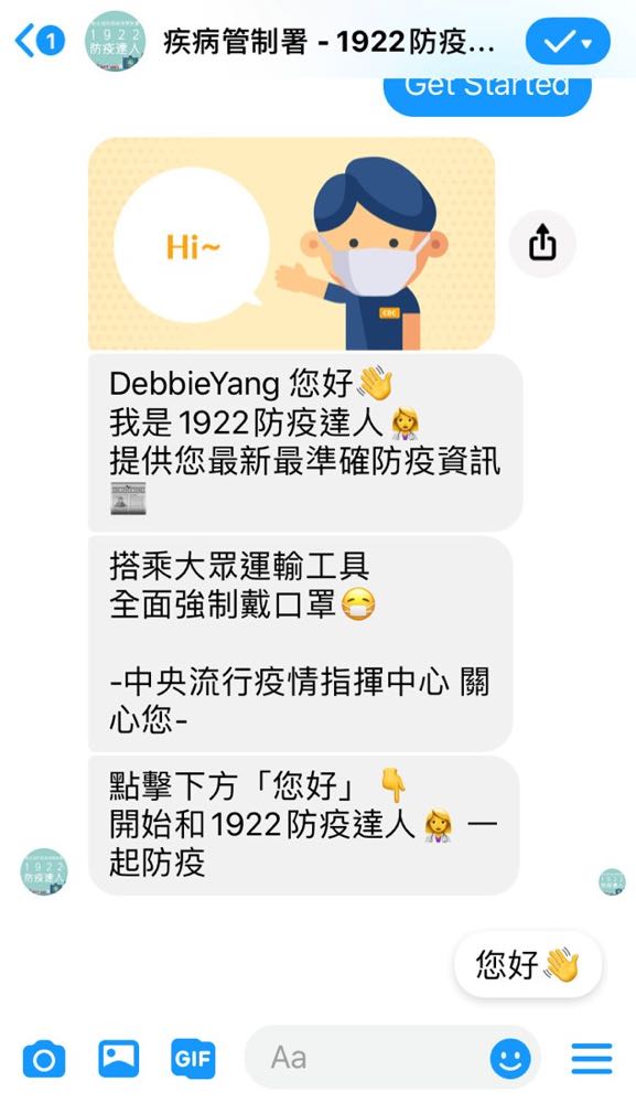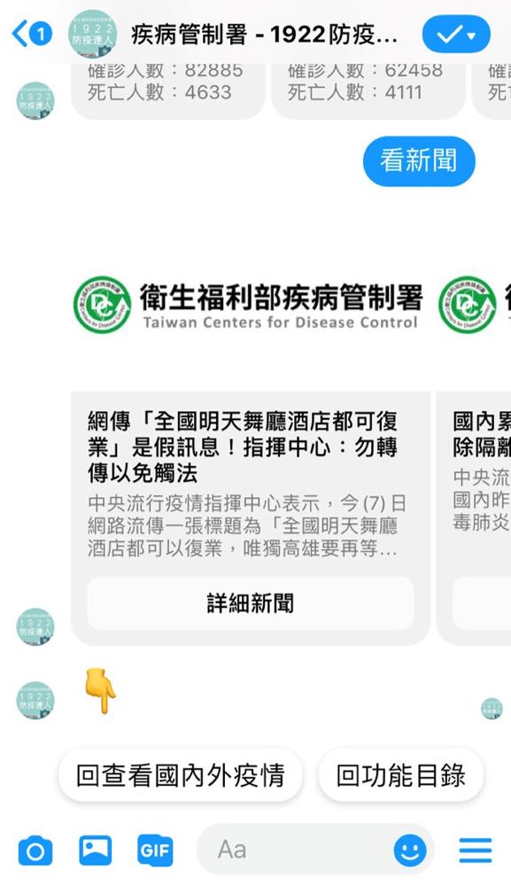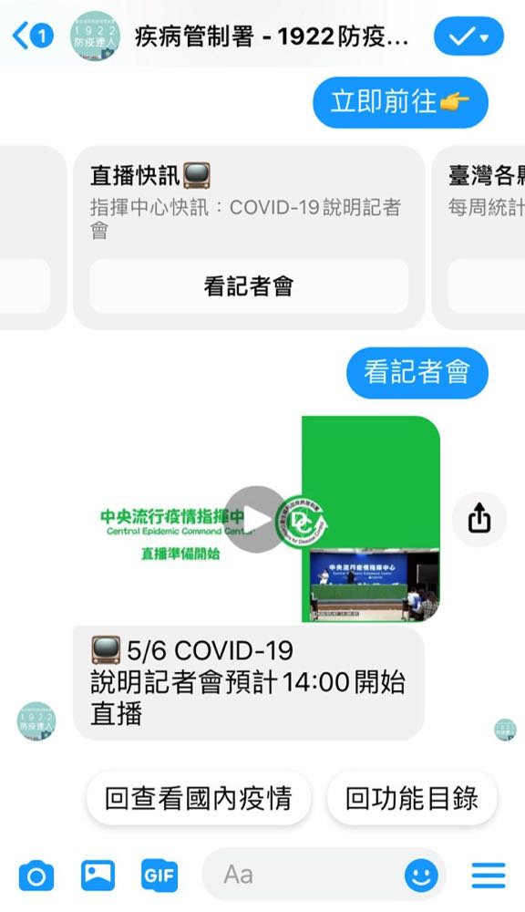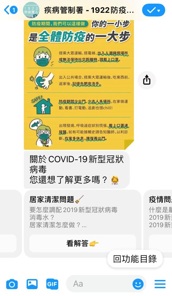 相關資訊,例如「查看國內外疫情」、「預防 COVID-19」、「口罩哪裡買」、「假消息澄清區」以及「撥打 1922」。除了提供最新資訊,聊天機器人也將被運用在疾病管制署於 Facebook 上的直播,以提供大眾 COVID-19 相關的內容。