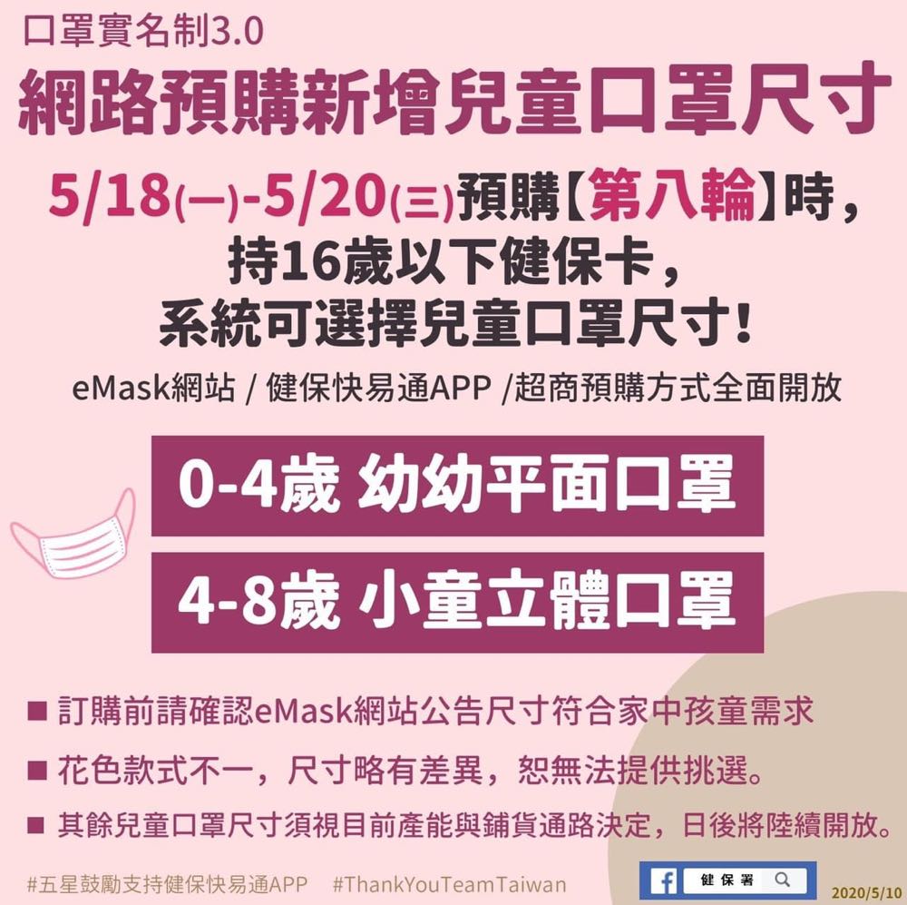 為了讓小朋友們都能夠使用到真的符合自己臉型大小的口罩,5/18 (一) ~ 5/20 (三) 第八輪預購開放時,只要持 16 歲以下健保卡,系統新增就可以選擇兒童口罩尺寸囉‼