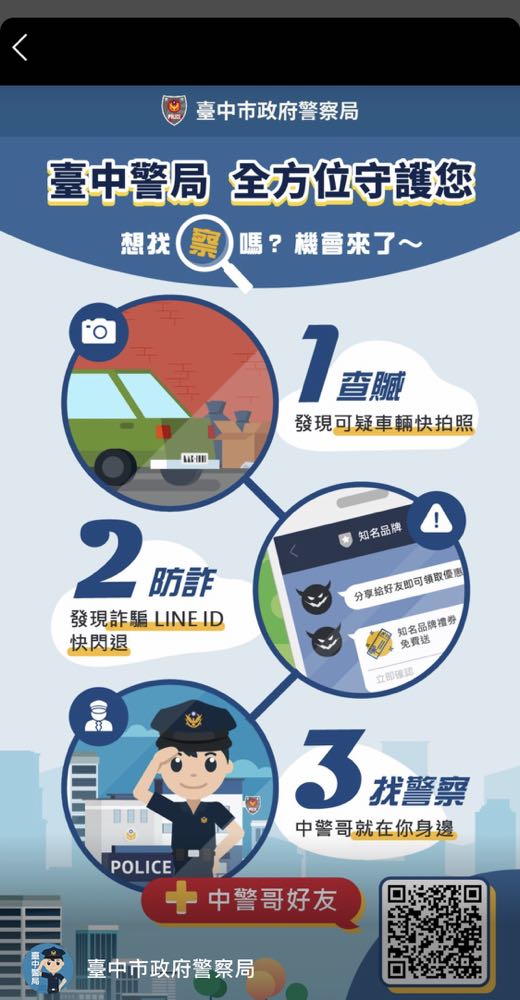 如果也對贓車查詢有興趣的朋友,現在就能透過搜尋 LINE 的官方帳號:「台中市政府警察局」,或是上方照片的 QR code 來加入好友一起 “肉搜” 身邊贓車唷!