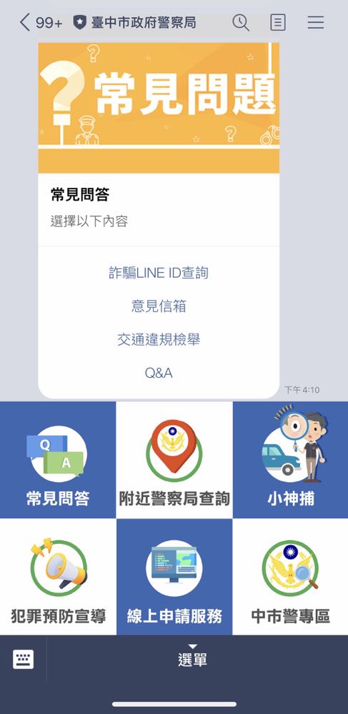 台中市警察局上月推出了 LINE 官方帳號「台中市政府警察局」,其中有個「小神捕」的功能,就是能讓大家直接輸入車牌或是用拍照的方式來進行確認。