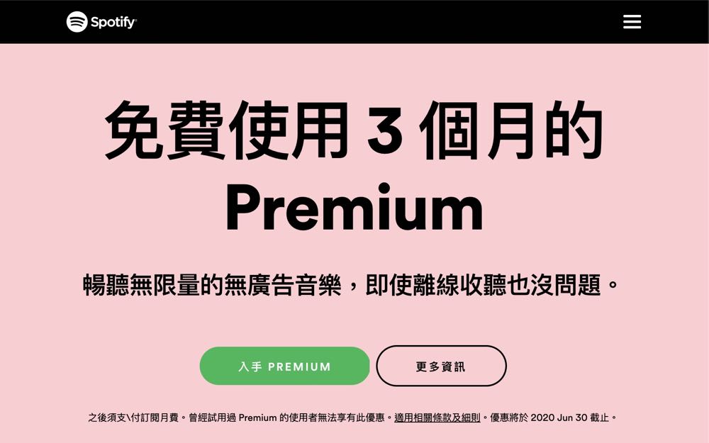 如果你都沒試用過 Spotify Premium 的使用者,現在或許可以考慮了!因為 Spotify 在 6 月 30 日前推出三個月免費體驗 Premium 的服務!