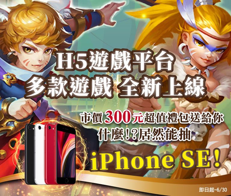 「H5 遊戲平台」初期提供10款手遊大作,支援電腦、智慧手機和平板跨裝置遊玩,通勤時玩手機、回家玩電腦,遊戲資料跨平台同步更新,即日起登入即送市價 300 元超值禮包,為滿足衝等控、裝備控的重度玩家需求,提供多元便利儲值選擇,無信用卡者可透過 GtPay 付款,輕鬆使用電信帳單代收儲值費用,6 月 30 日前,不限金額儲值抽 7-ELEVEn 購物金,限 50 名、儲值滿 2,000 元有機會帶走最大獎 iPhone SE,限 1 名。