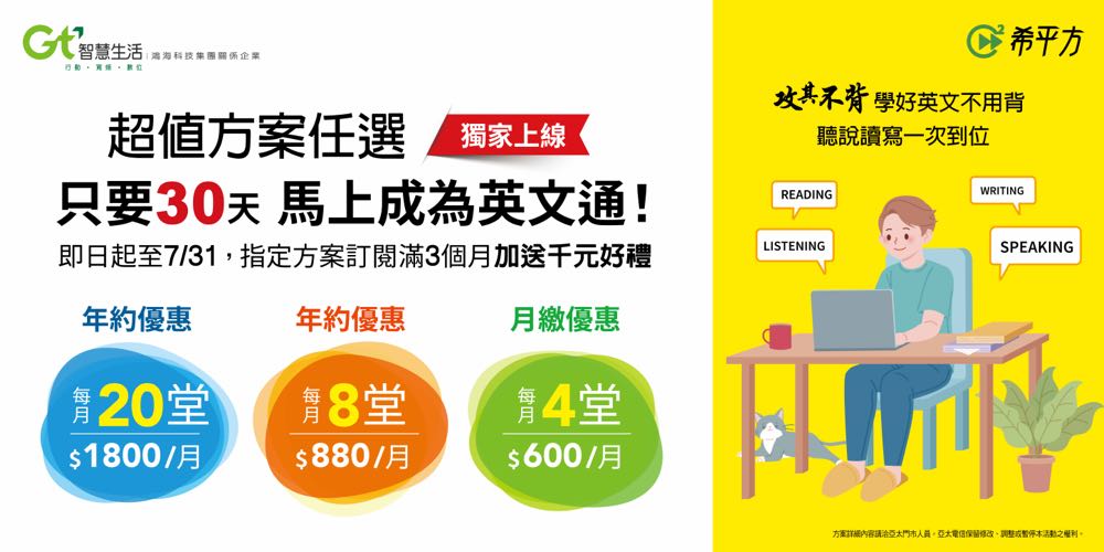 台灣新冠肺炎案例持續零確診,民眾防疫措施仍不鬆懈,促使線上學習平台需求高速成長。亞太電信看準用戶需求,首度與線上英文學習系統領導品牌「希平方」獨家跨界合作,免預約、在家打開電腦/手機/平板隨時就能上英文課,提供考證照、出國留學、商務應用等六大主題課程,客製化訂定不同學習目標,打造聽說讀寫全方位計畫式教學計畫。