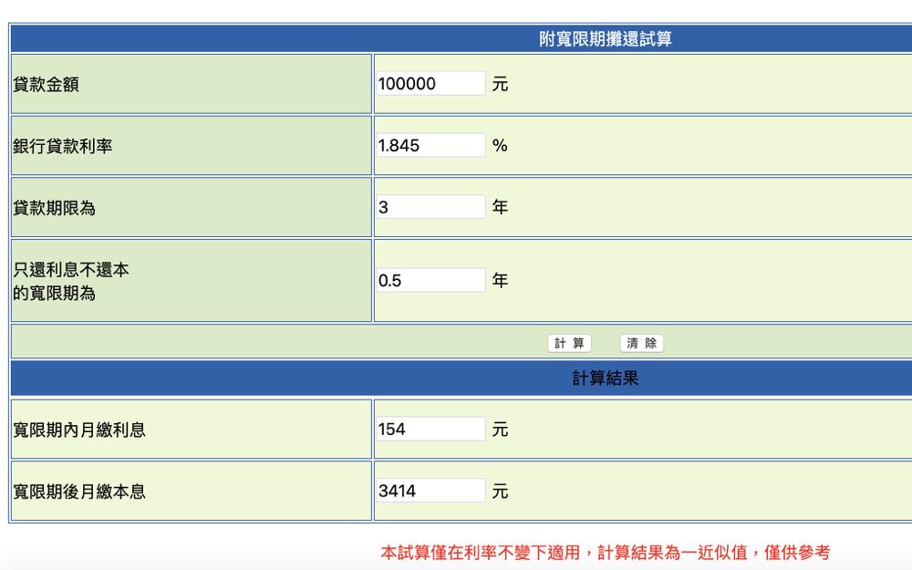 只還利息不還本的寬限期:0.5 年