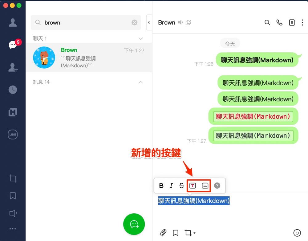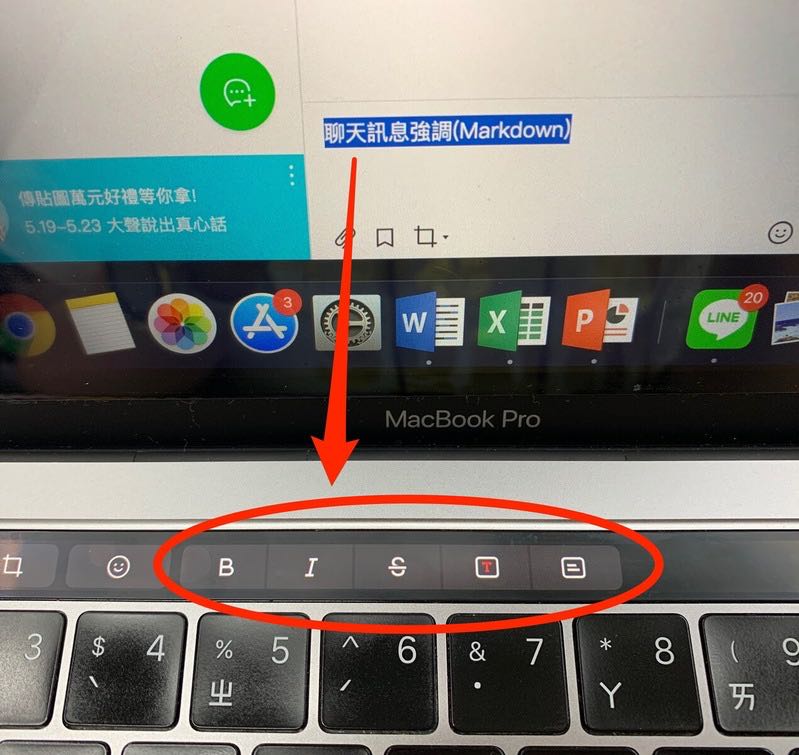 ▼ 聊天訊息強調:更新後,反白文字後,可在 Mac 觸控列中點選想要的字型。(MAC 限定)