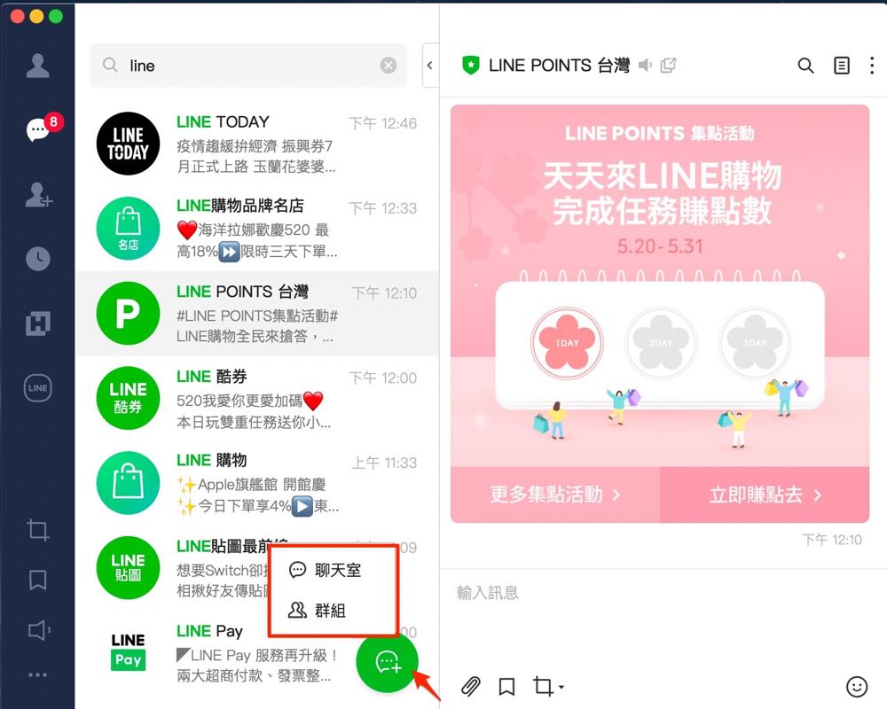 未來 LINE 電腦版將會有更多介面,努力與手機版一致。像是畫面上有一個懸浮按鍵,點選後原本只能建立新聊天室,更新後,點選下去也可以直接建立群組。