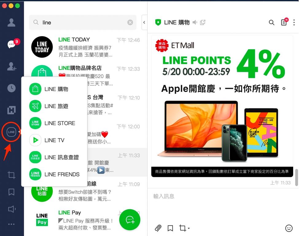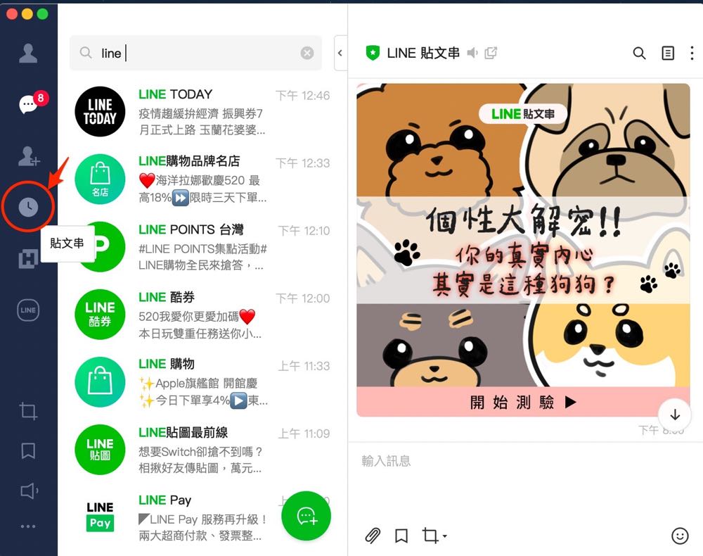 ▼ 在電腦版主選單點選LINE貼文串圖示,將直接開啟網頁版。