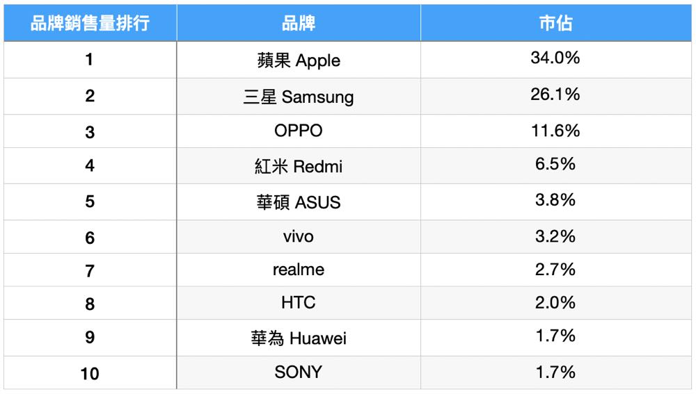 2020 年 4 月份台灣市場各大手機品牌的市佔排名,從第 1 名到第 10 名分別是 Apple、Samsung、OPPO、紅米、ASUS、VIVO、realme、HTC、華為、Sony,其中 VIVO 從上個月的第 9 名躍升到了本月份第 6 名的成績。而 Apple 雖然同樣稱霸,但市佔比則是從 27.9% 提升到 34.0%、三星也從 22.5% 提升到 26.1%、OPPO 從 9.1% 提升到 11.6%。