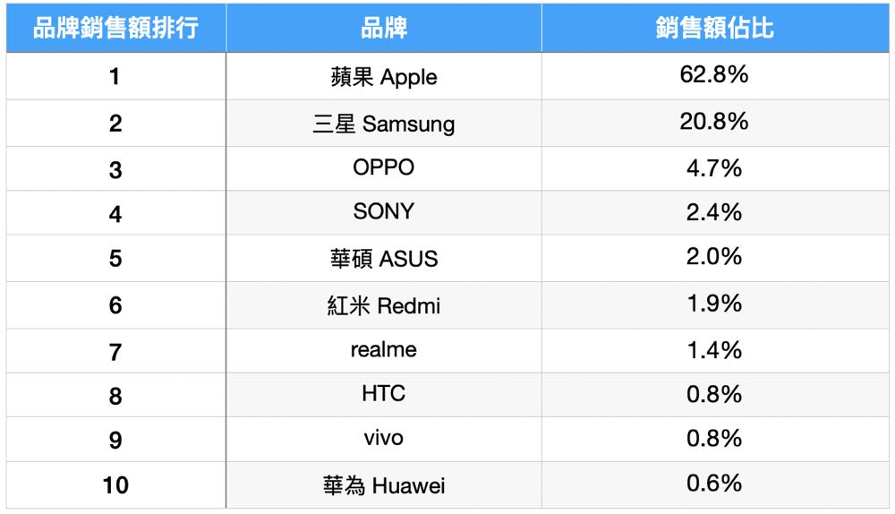 至於在銷售額的部分,從第 1 名到第 10 名分別是 Apple、Samsung、OPPO、SONY、ASUS、紅米、realme、HTC、VIVO、華為,或許是因為 Apple 在 4 月推出了 iPhone SE2,再加上 iPhone 11 的長期熱銷,不只拿下第一名寶座,還直接拿下 62.8% 的銷售額佔比!