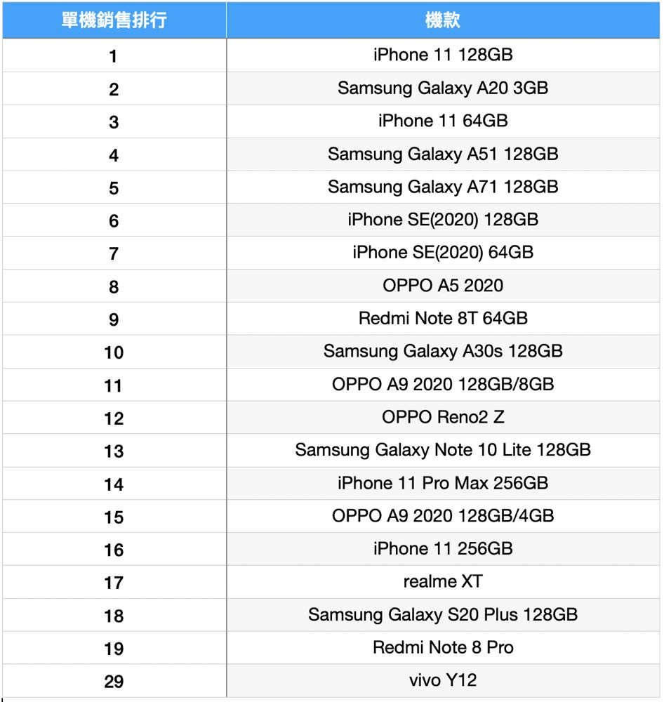 我們可以看到 20 名之中,Apple 的 iPhone 系列就以 iPhone 11 128GB / iPhone 11 64GB / iPhone SE(2020) 128GB / iPhone SE(2020) 64GB / iPhone 11 Pro Max 256GB / iPhone 11 256GB 拿下 6 個名次;