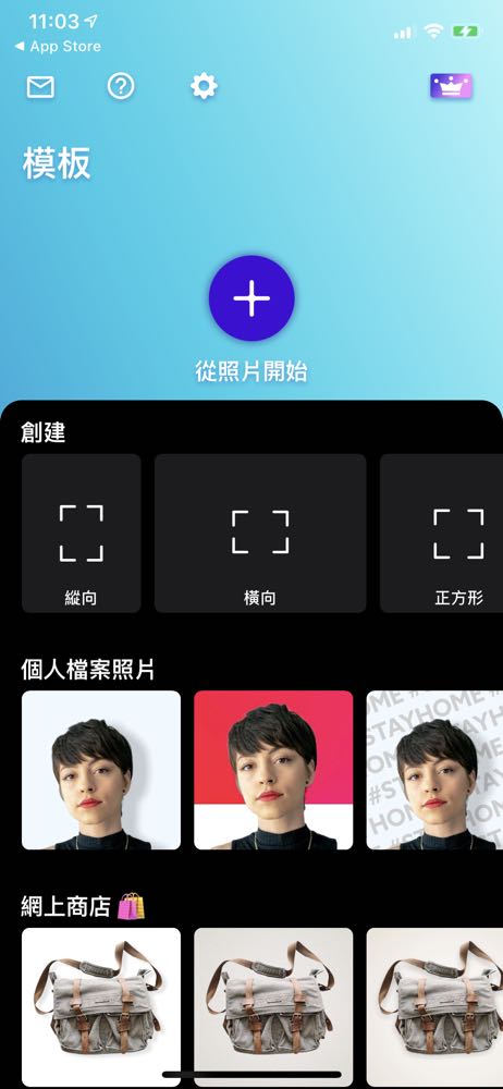 2) 開啟 PhotoRoom 後可以選擇「+」來輸入想要去背的照片,在輸入照片前,我們也可以看到下方除了最基本的個人照片去背功能外。還能依照不同需求來選擇多種模版。如果是商品的話看是要用「線上商店」或是「時尚彩虹」來替商品換上單一色的背景凸顯特色,還是「網上商店衣櫃模式」、「網上商店平鋪模式」來加入豐富的背景風格。