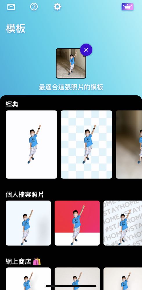 4) 看到去完背的圖片滿意後,接下來可以套用喜歡的版型。然後每個版型裡面還能再進階依照不同的格式來一一調整,例如文字呀、背景呀、人物這樣,調整的方式則是能加入動畫、轉動角度、變更文字內容、調整亮度等等。