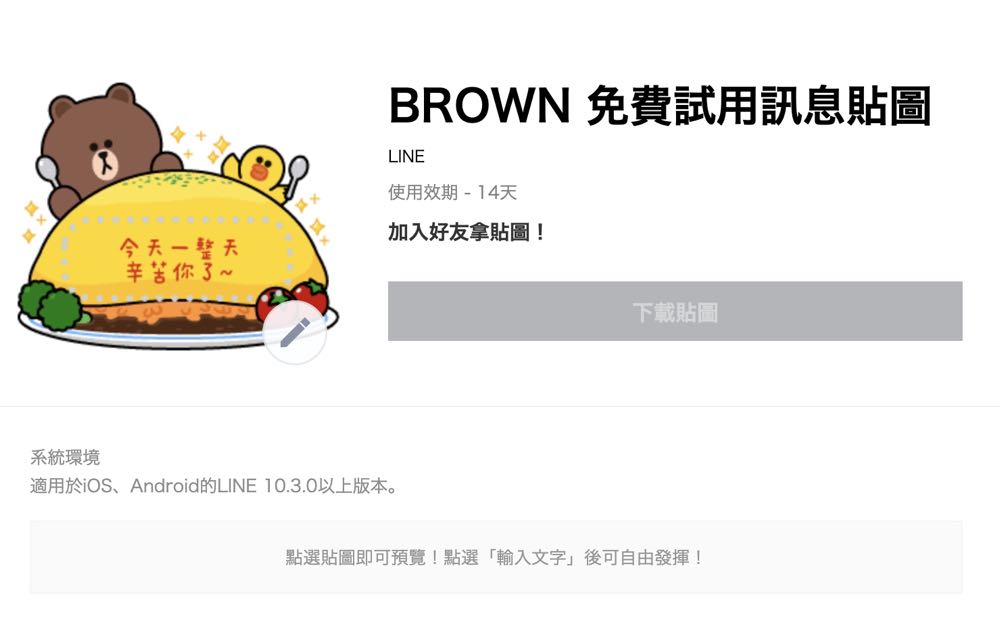LINE 的訊息貼圖有很多種,除了可以換名字的貼圖、用自己照片客製化貼圖外,還有能自行輸入想要顯示文字的訊息貼圖。而現在 LINE 為訊息貼圖帶來《BROWN 免費試用訊息貼圖》的試用,只要加入「貼圖最前線」官方帳號好友就能免費下載 14 天體驗唷!