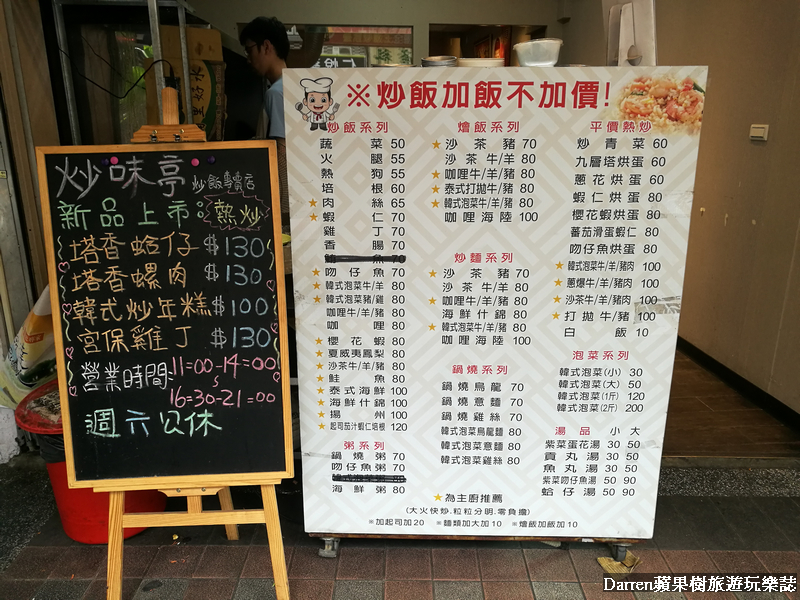 炒味亭炒飯專賣店菜單有炒飯、炒麵、粥、平價熱炒、泡菜系列、湯品等,有星號是主廚推薦,炒飯加飯不加價