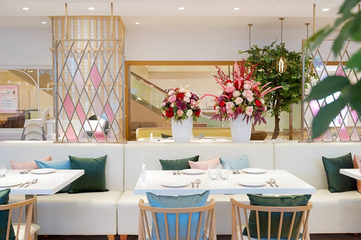 日照充足的時候,柔和的光線自然灑進,白天來用餐真的很舒服。純白色的桌子與淡雅的粉色調、藍綠色系軟裝做搭配,在充滿清新溫柔的氛圍中帶有些微泰國的濃豔色,恰到好處,是 Lady nara 沒錯。