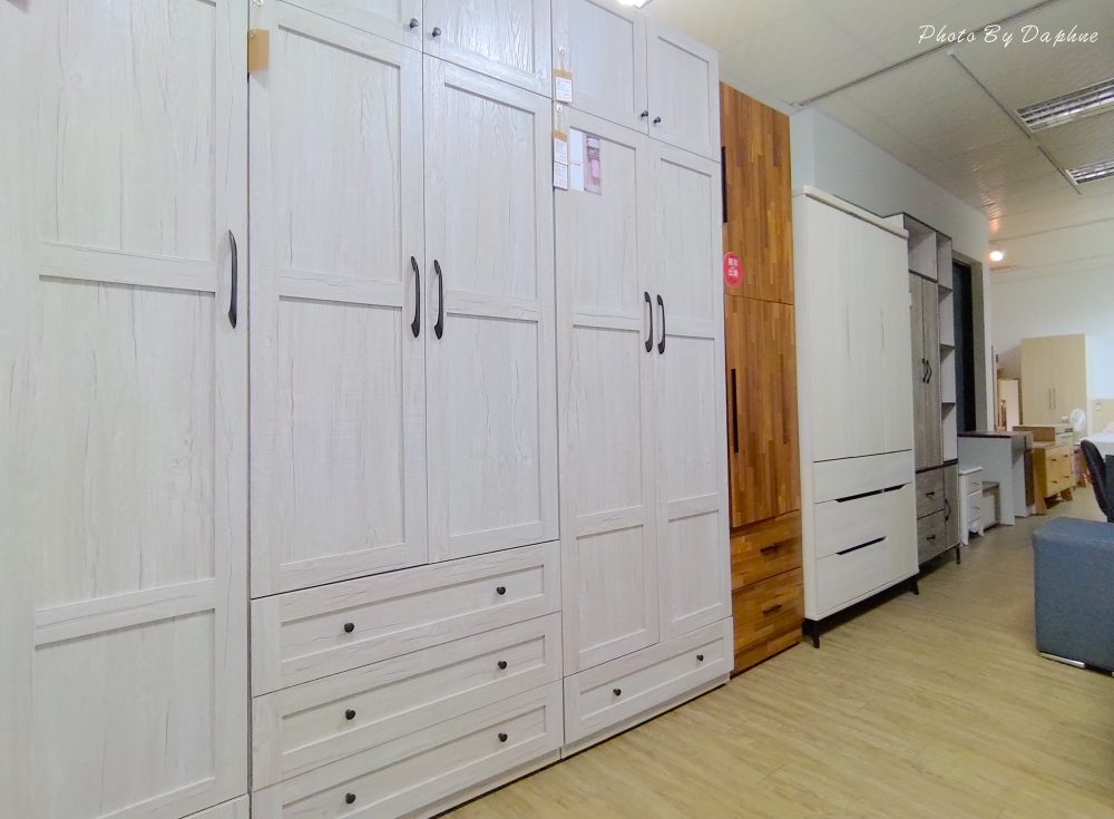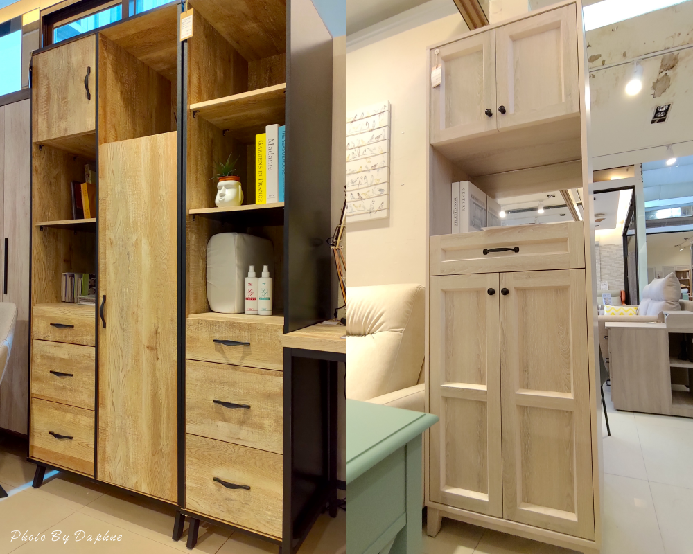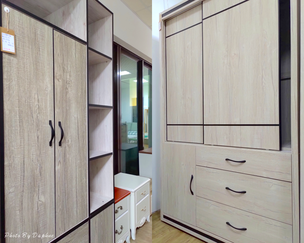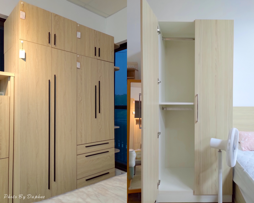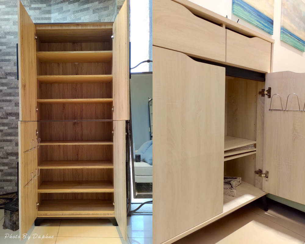 ▼衣櫃有掛勾真是太實用,梅雨季時,返家後剛好能掛鞋子陰乾,搭配各烘鞋機或除濕機,右邊的亞利鞋櫃,在現場備有各種木料,可現場選色訂製。