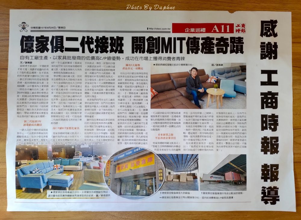 ▼億家具批發倉庫第二代老闆接班時不到三十歲,主打 MIT 工廠自製自售、價格實惠的家具,近年來也善盡社會責任,在商品材質上,採用可回收或是可分解材質的布料,降低環境的負擔。
