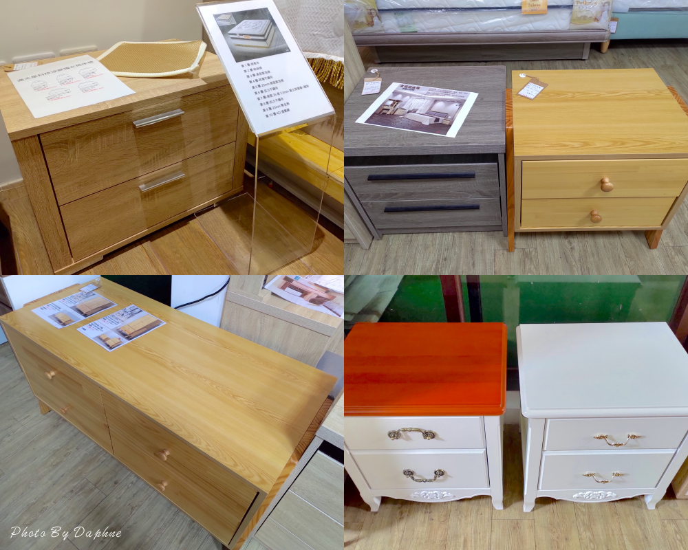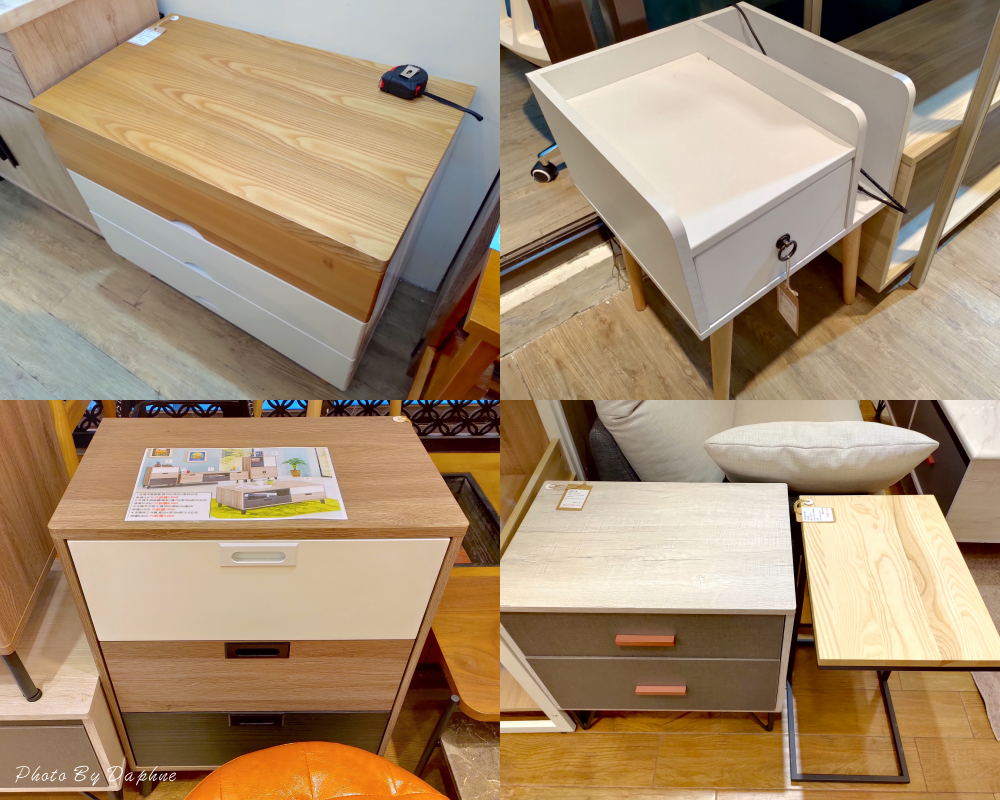 ▼雅蒂斯臘木白三斗櫃、無線充電床頭櫃、古橡木三斗櫃、穆蘭小櫃、日和原木小邊几自然雅緻,有的是多色拼接融合。
